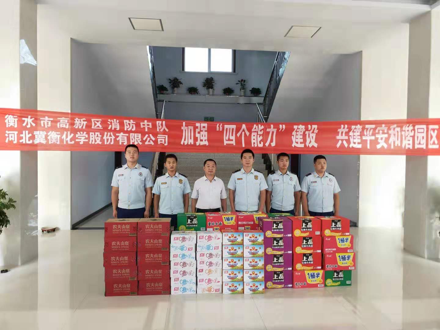 7月31日下午,我公司安全管理部曹云輝主任代表公司領(lǐng)導(dǎo),走訪慰問(wèn)了衡水市高新區(qū)消防中隊(duì)官兵,并送去了飲用水等防暑降溫物品, 盡顯了軍民魚(yú)水之情。在慰問(wèn)中曹主任對(duì)消防中隊(duì)官兵對(duì)冀衡化學(xué)給予的大力支持和幫助表示衷心感謝,冀衡化學(xué)作為消防重點(diǎn)單位,各項(xiàng)工作得到了市、區(qū)消防支隊(duì)和大隊(duì)的服務(wù)及指導(dǎo),雙方多次進(jìn)行消防演練,共同提高消防應(yīng)急協(xié)作能力,希望在今后的工作中繼續(xù)保持良好的警民合作共建關(guān)系,互相支持,互相合作,進(jìn)一步加強(qiáng)“四個(gè)能力”建設(shè),共同建設(shè)和諧平安園區(qū)。