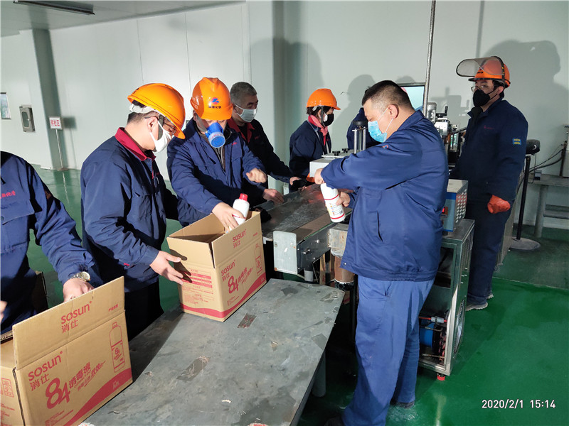 共產黨員、公司辦公室主任劉豐(左一)在84消毒液生產現場