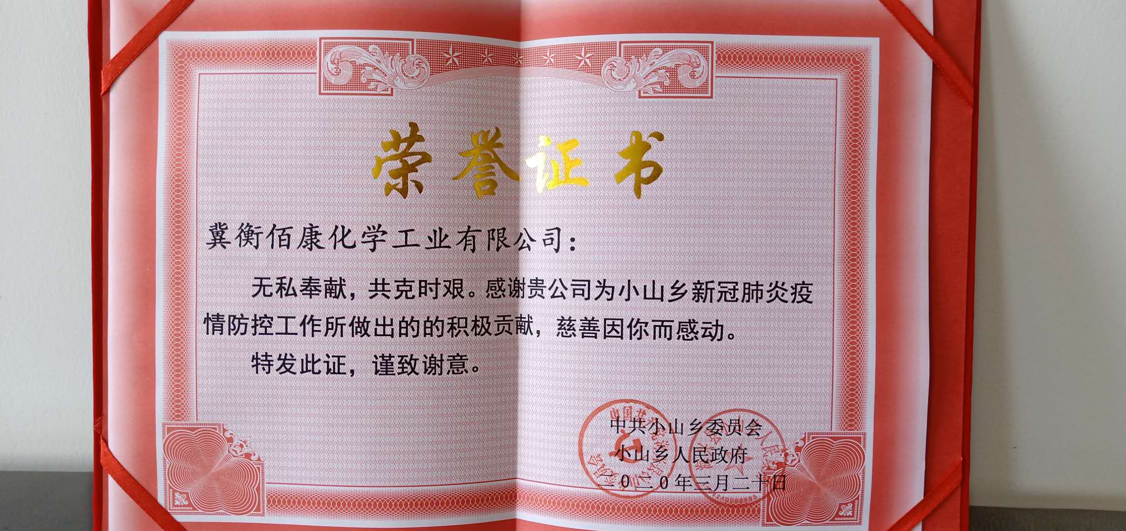 近日,海興縣小山鄉黨委、鄉政府為感謝佰康公司在疫情防控期間,積極為小山鄉防疫捐贈消毒用品頒發榮譽證書,佰康公司表示,作為一家海興縣的企業,盡自己最大的努力協助當地抗擊疫情,是企業義不容辭的責任,今后佰康公司將堅持疫情防控和安全生產兩手抓、兩手硬的要求,確保實現疫情防控和安全生產的雙勝利,為海興縣地方發展作出應有的貢獻!